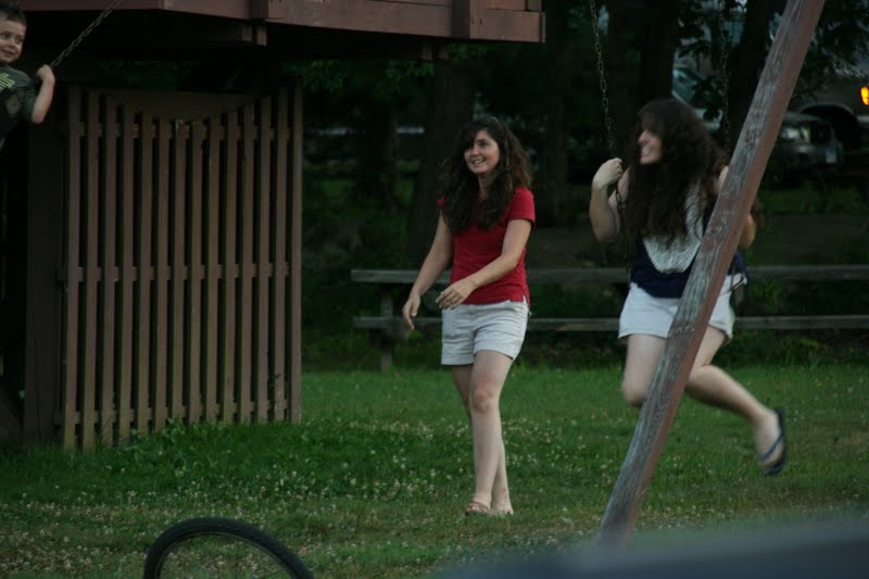 The family all gathered at our campsite for a cookout and good times. The kids enjoyed the playground, played frisbee, cooked marshmallows and had a great time catching up with each other. Dick cooked burgers and hot dogs, Pam brought fresh veggies and squash bread and Brian brought tomato pie. Chris brought a pile of wood for our campfire.